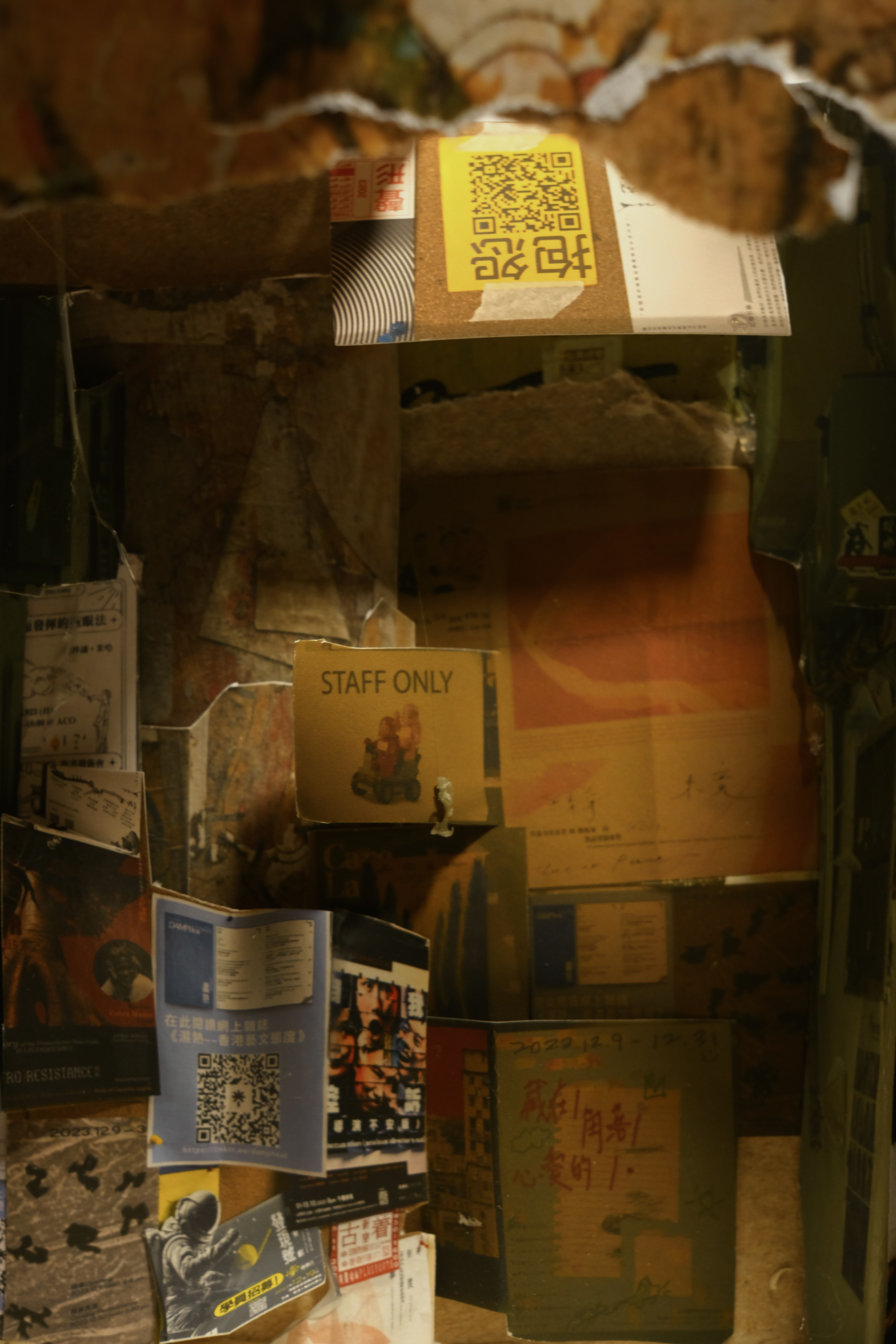 To enter this hidden territory, one has to walk through the staircase to reach a retro elevator at the end of the hallway. The floor numbers blink one after the other as the elevator trembles to a sudden stop and opens to a beige interior – just enough space for two people to squeeze in. On every surface, layers of stickers ripped notes, and taped posters form a superimposed landscape of signs. The seemingly chaotic configuration of information has an inner temporal logic. Old messages are buried beneath the more recent ones. Words and images accrue uncanny links with each other as they overlay and juxtapose. A printed slogan “consciously observe the present reality” leads to a series of headless animals chasing after each other.